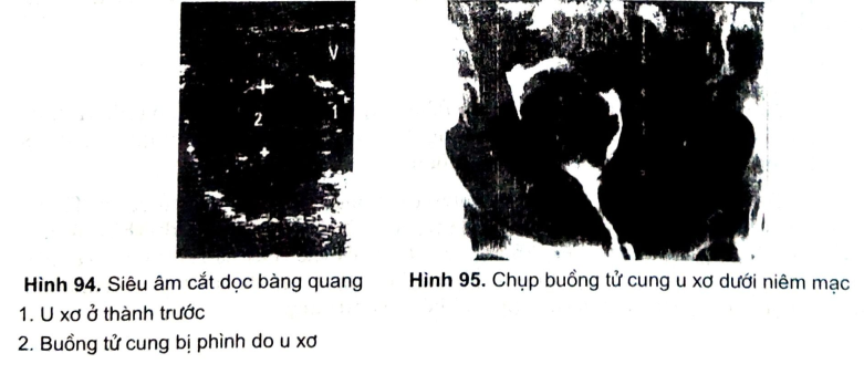 - Âm vang của u xơ tử cung thường không có ranh giới rõ với hình ảnh tử cung. Âm vang không đều có thể nghĩ đến phù, hoại tử...