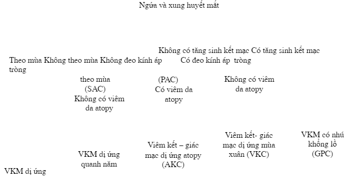 - Triệu chứng chẩn đoán: ngứa mắt, chảy nước mắt, xung huyết mắt, cảm giác có dị vật trong mắt, xung huyết kết mạc, phù kết mạc, và nang kết mạc.