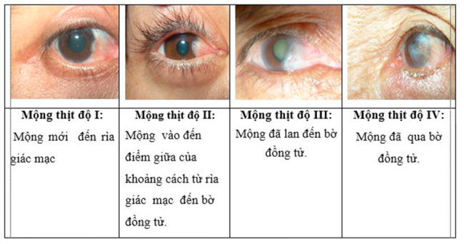 ?Mộng có hình tam giác hay hình cánh với đỉnh quay về phía giác mạc; có thể màu đỏ hoặc hồng tùy theo số lượng và độ cương tụ của mạch máu thân mộng.